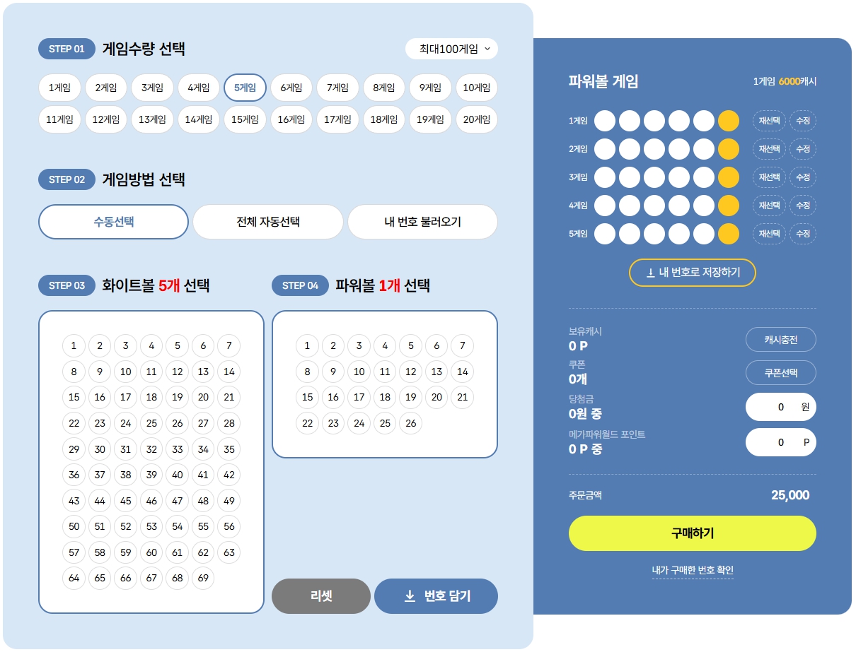1부터 26까지의 숫자 중 파워볼 1개를 선택하여 총 6개의 번호를 선택합니다.